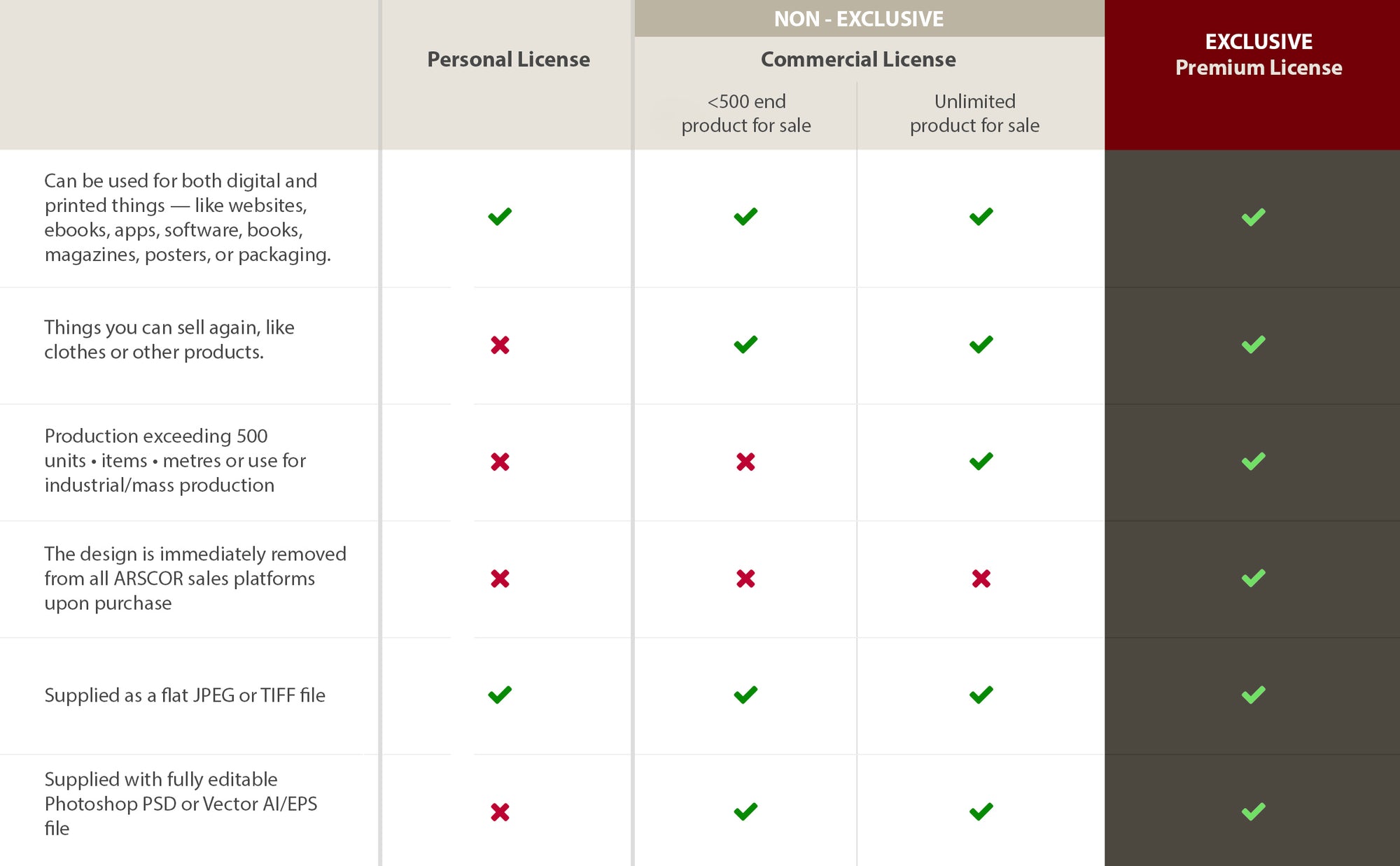 - Exclusividad: El diseño se elimina inmediatamente del sitio de ARSCOR luego de la compra y nunca se revenderá a nadie más.
