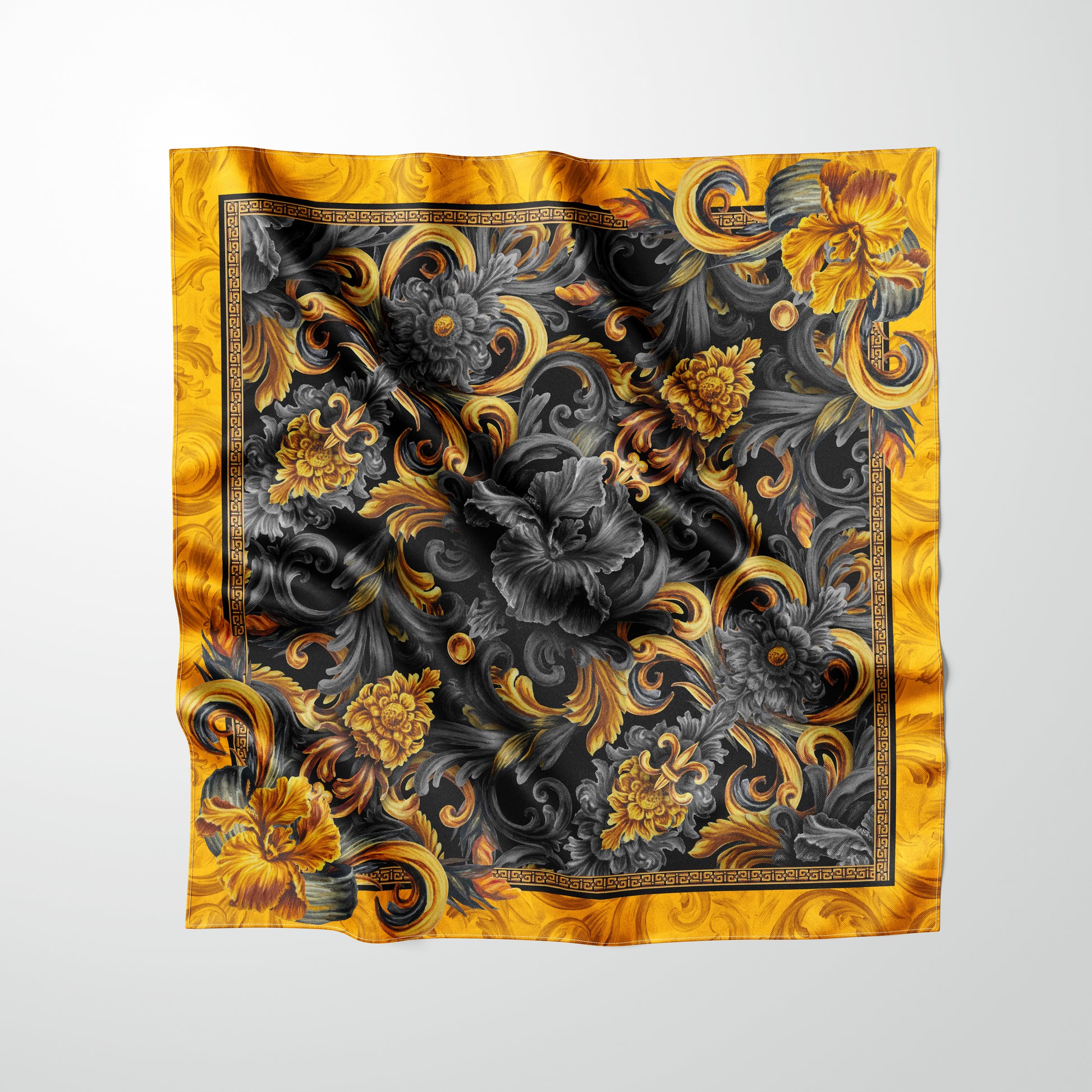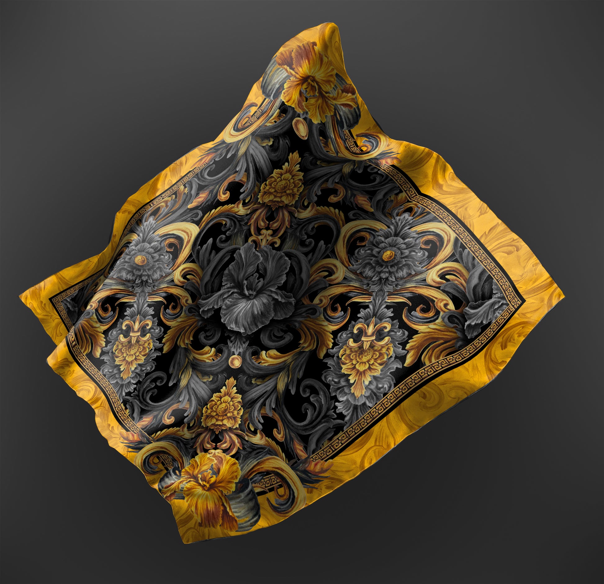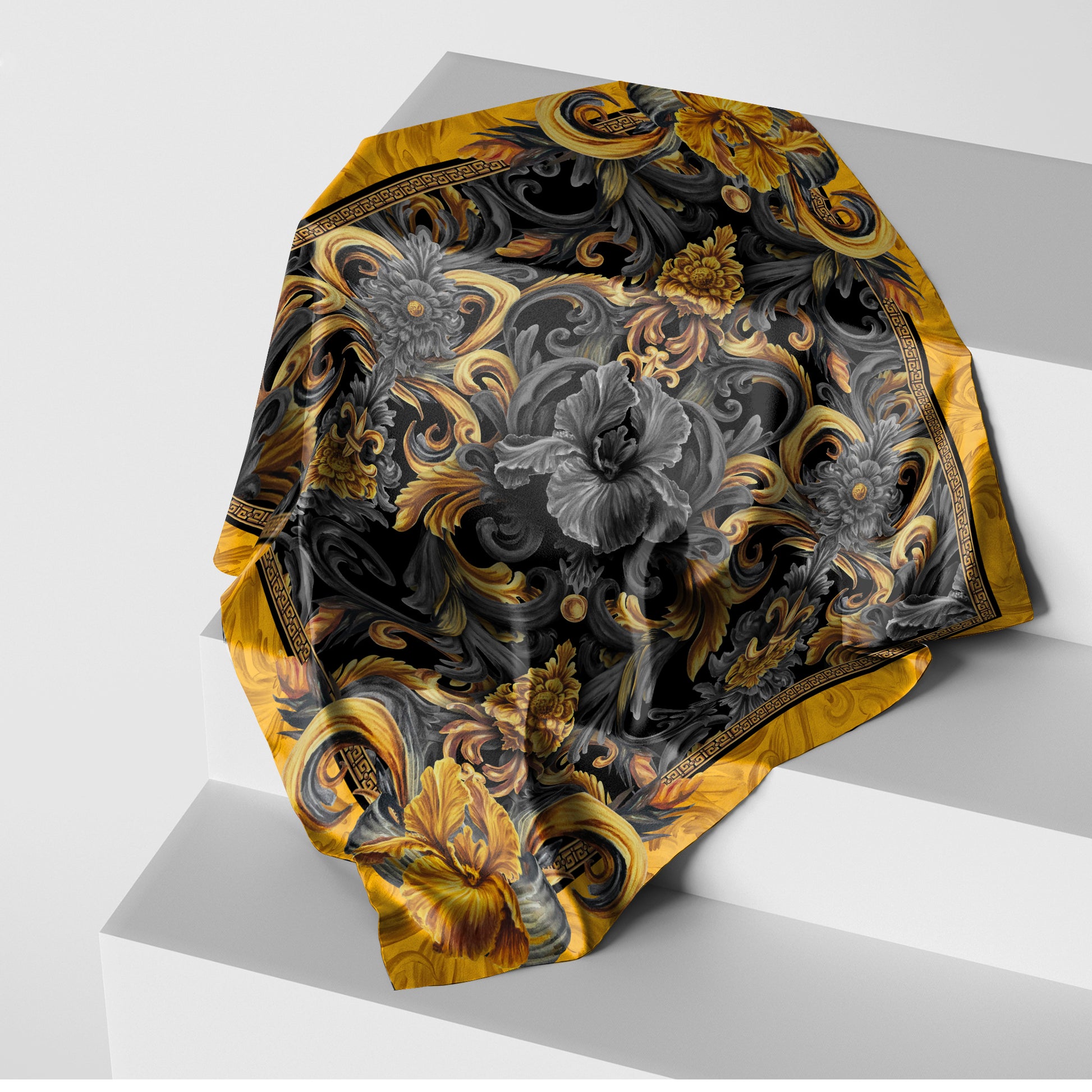The Golden Iris scarf boasts a captivating baroque print, meticulously crafted with opulent golden floral and intricate scroll motifs. These rich details are set against a sophisticated dark grey and black background, creating a dramatic and luxurious contrast. Featuring prominent golden irises, this design exudes timeless style and artistic flair, making it a versatile accessory that instantly elevates any ensemble.