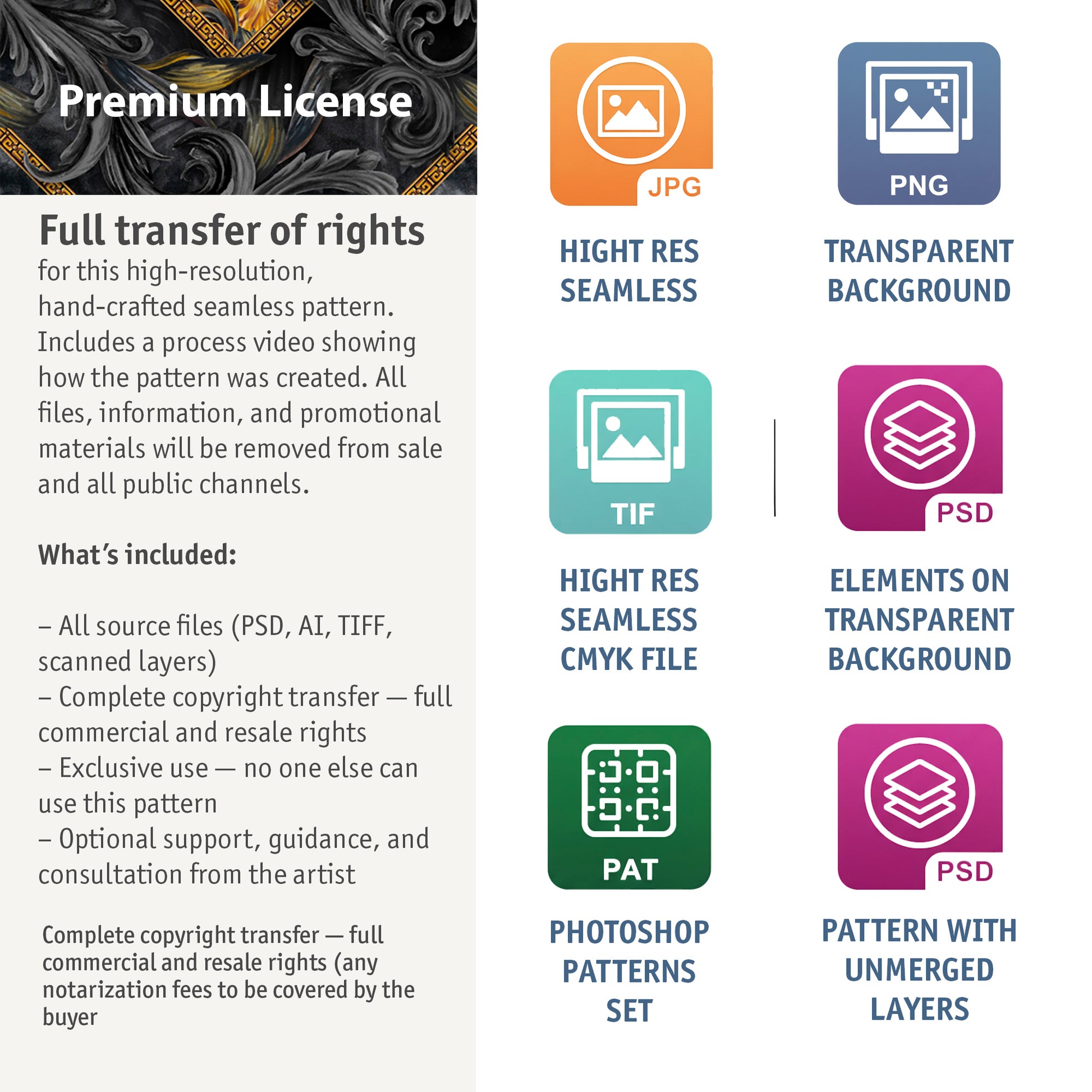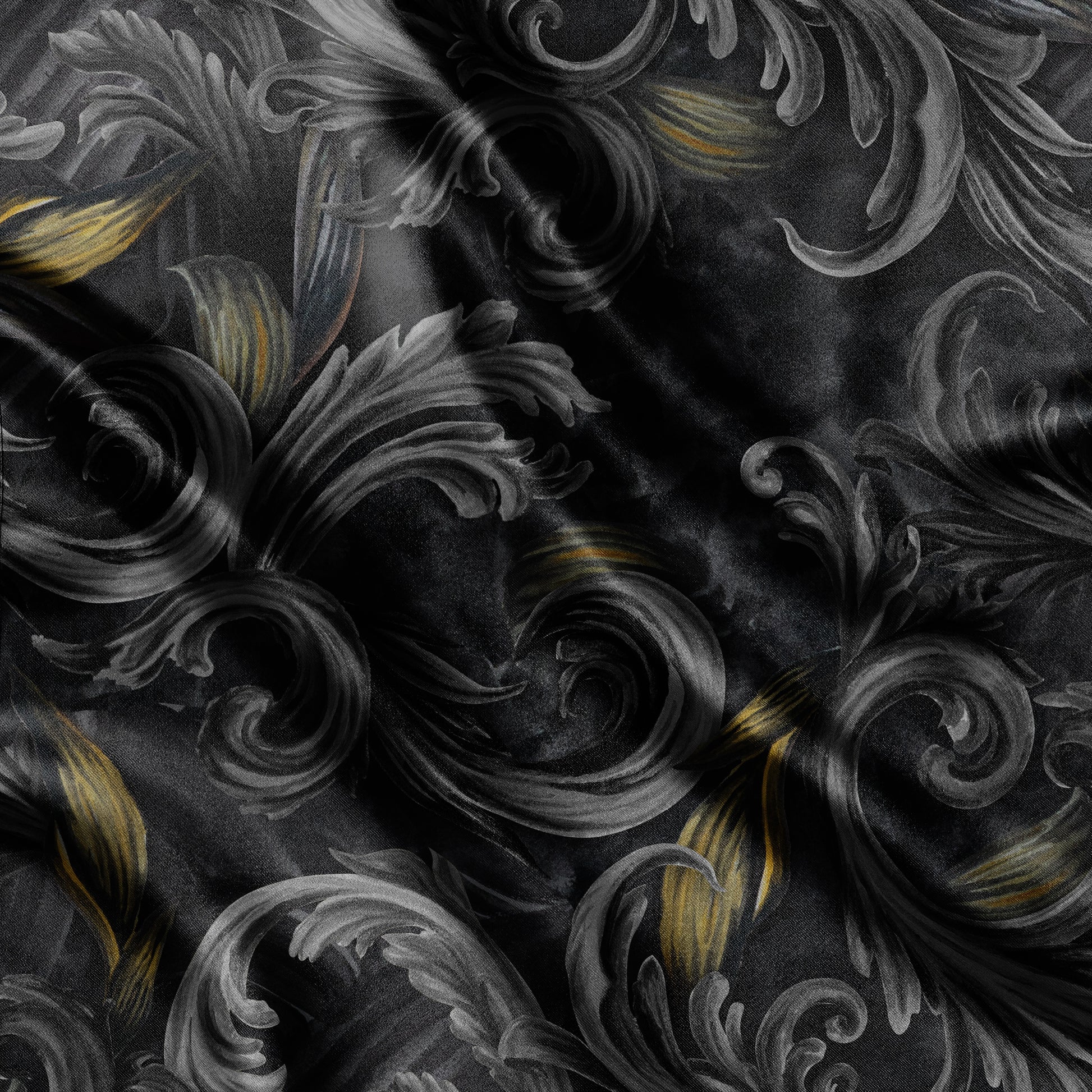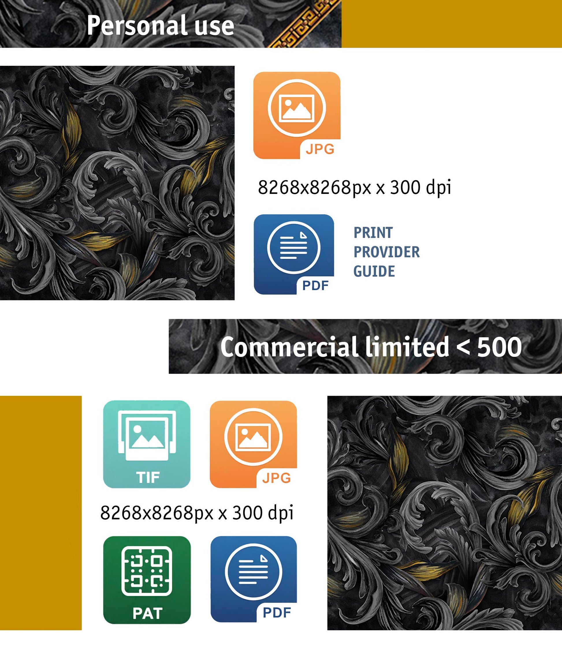 Golden Iris Noir is a premium seamless pattern, hand-painted with acrylic in luxurious black and gold tones. Inspired by classic baroque motifs reimagined for contemporary B2B needs, it is available in three distinct variations for maximum adaptability. Perfect for wallpaper printing, fashion textiles, packaging, accessories, and high-end decor — this pattern caters to brands and studios seeking a unique, artistic touch for their products.