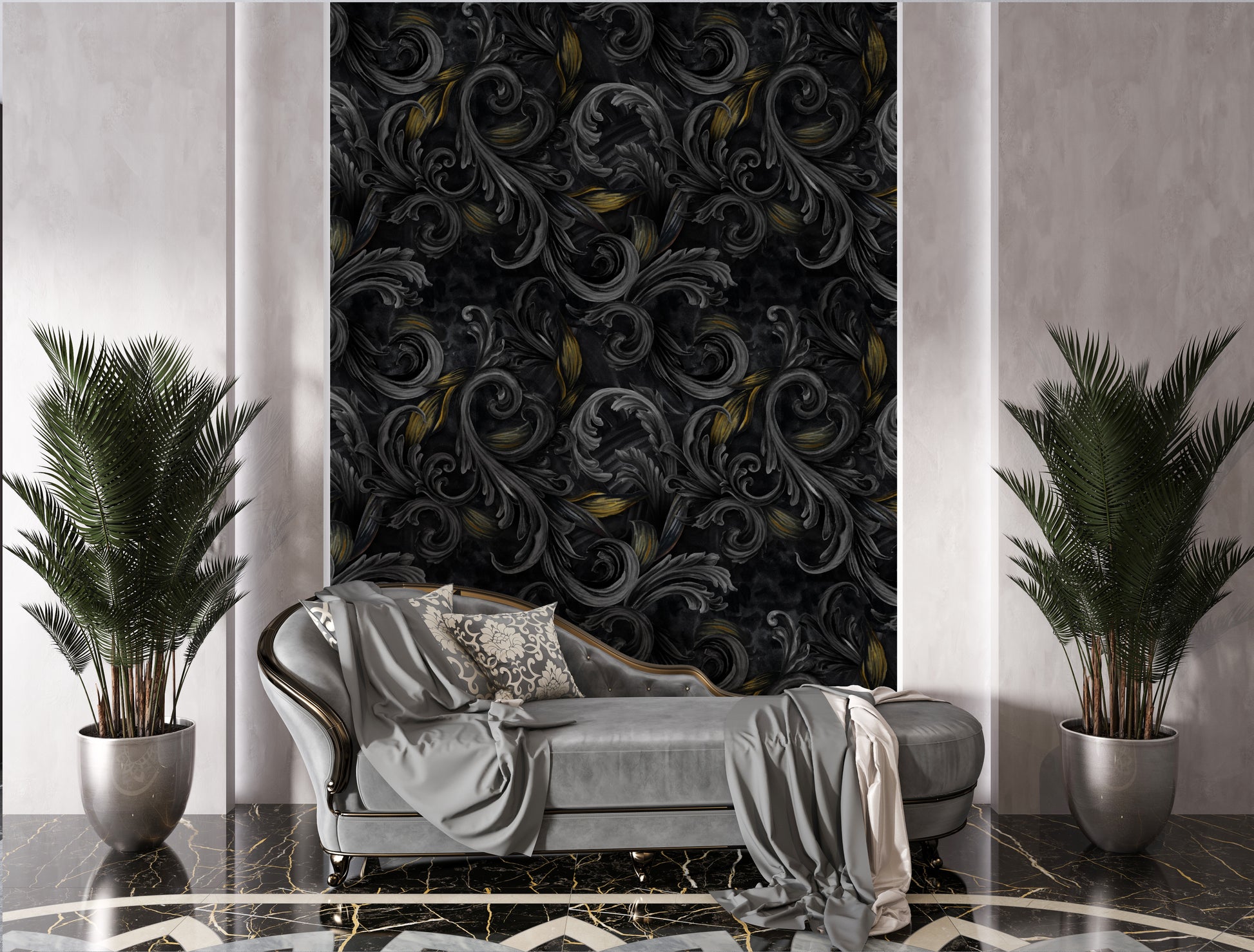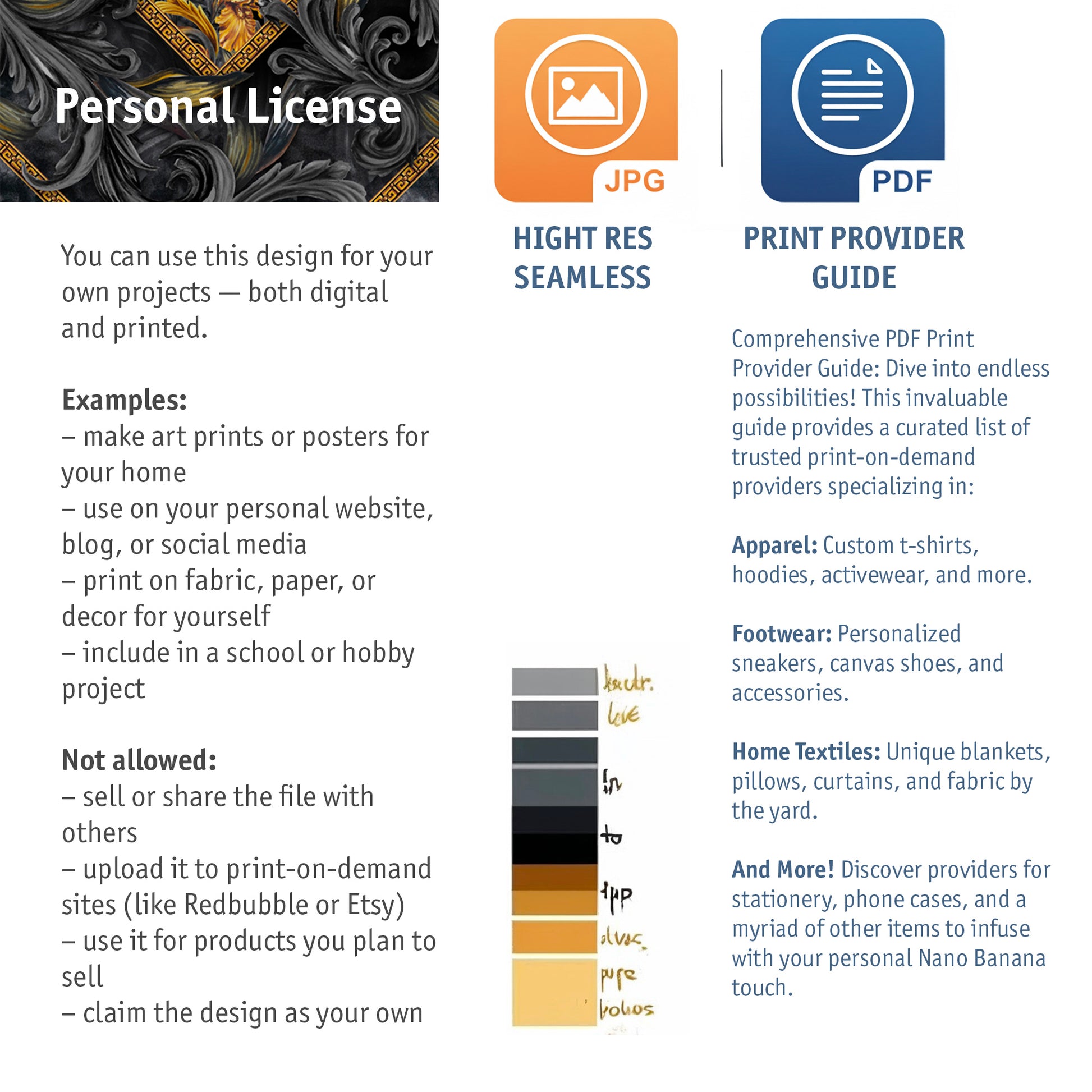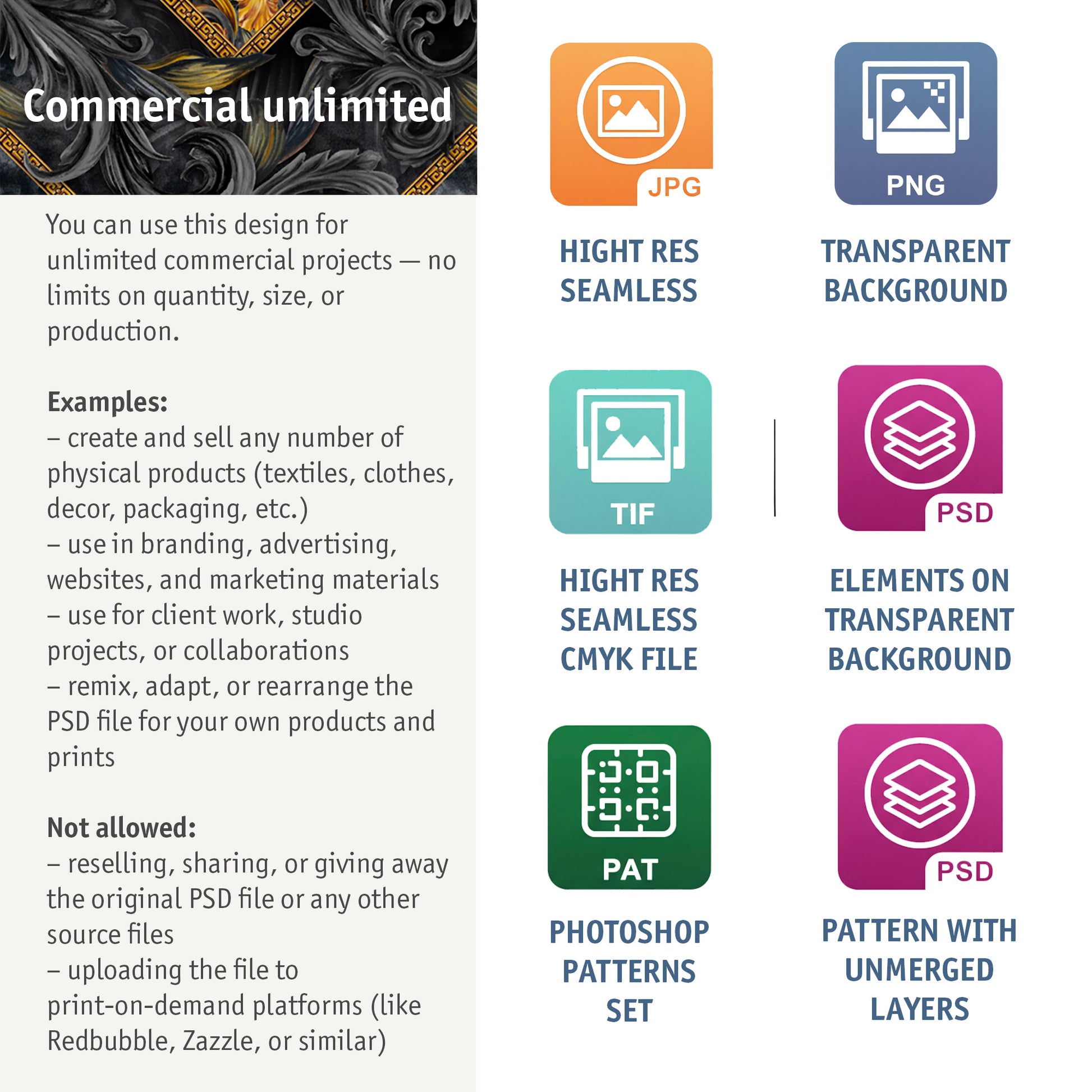 Golden Iris Noir is a premium seamless pattern, hand-painted with acrylic in luxurious black and gold tones. Inspired by classic baroque motifs reimagined for contemporary B2B needs, it is available in three distinct variations for maximum adaptability. Perfect for wallpaper printing, fashion textiles, packaging, accessories, and high-end decor — this pattern caters to brands and studios seeking a unique, artistic touch for their products.